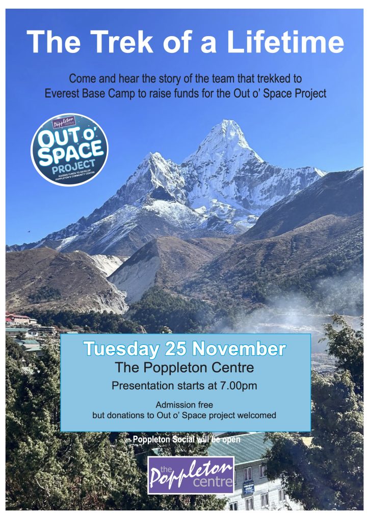 On Tuesday 25th November come along to see and hear the story of the 14 Poppleton folk who made the unforgettable trek to Everest Base Camp to raise funds for the Poppleton Centre Out o’ Space Project.